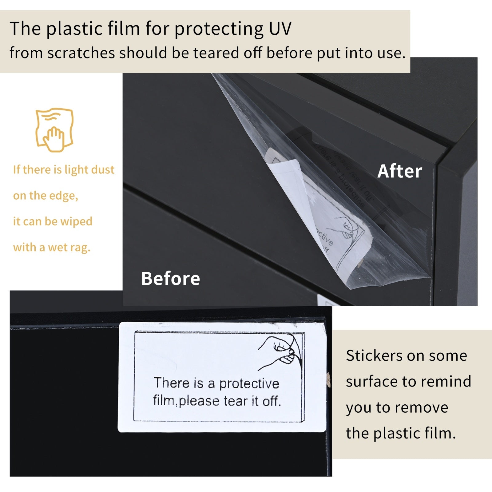 The plastic film for protecting UV from scratches should be teared off before put into use. If there is light dust on the edge, it can be wiped with a wet rag.